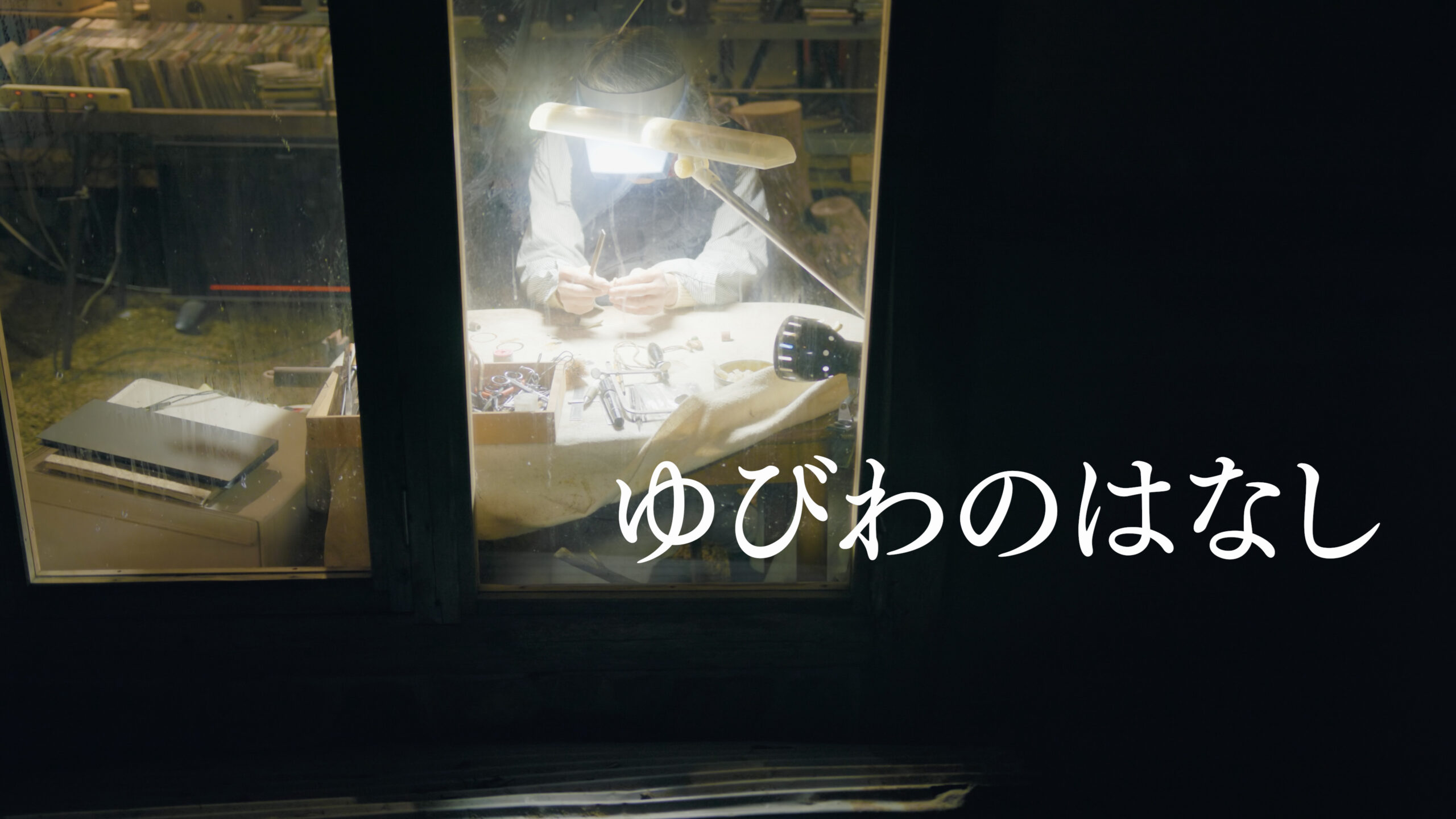 それが先祖のまなざしだとしたら、生きている人の世界は一体どう見えるのか。外に出て、裏山と工房の間に三脚を立て、窓ガラスの向こうで黙々と指輪を削る萩下さんを撮る。自分でもカメラを動かしていることを忘れてしまうくらいの速度でパンしながら、音のない真夜中の一部になっていく。