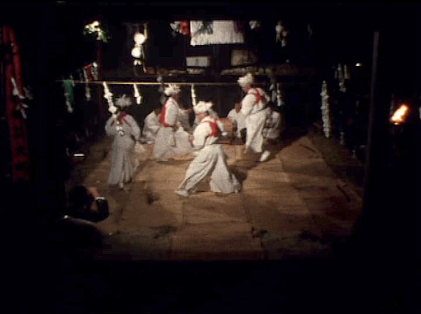 夜に入ると神楽が始まり、翌日午前十時頃まで行われる。舞うのは祝人。草分けの家を中心にした旧家の人々で、世襲である。村の男女が歌を掛け合う神楽囃子は、古代の歌垣を思わせる。