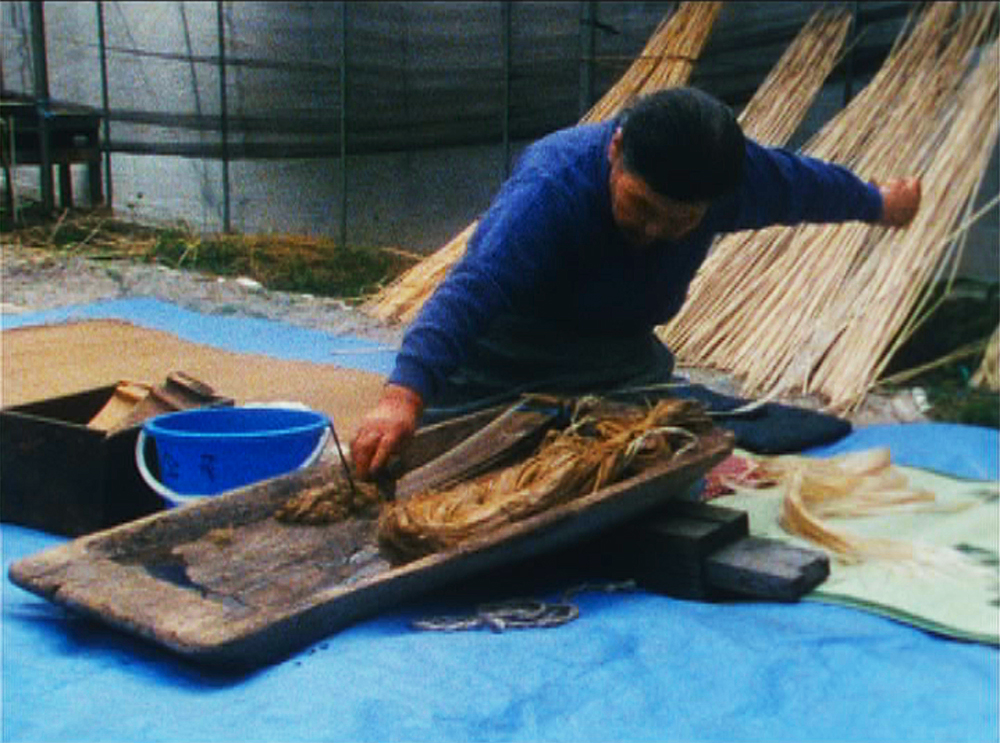 冬、糸を作り、布を織る 。 まず苧うみ。 繊維を爪で細くさき、唾でしめらせながら長くつないでいく。これに糸車で縒りをかけ、糸にする。次に糸ノベ。1反分の長さの経糸を必要な本数だけ数えとる。経糸をオサに通し、機にかけて織る。 機は地機である。昭和村の人は、カラムシには「キラがある」と言う。 きらめきの意味で、光沢のことをいう。